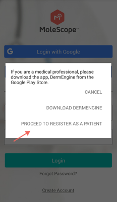 - A prompt will appear reminding you that MoleScope is for general users. If you are a medical professional, you should download DermEngine. Click "Proceed to Register As A Patient".