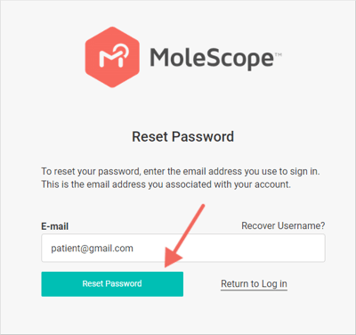- You will be redirected to https://app.molescope.com/account/password/reset/ To reset your password, enter the email address you use to sign in. This is the email address you associated with your account. Click Reset Password.