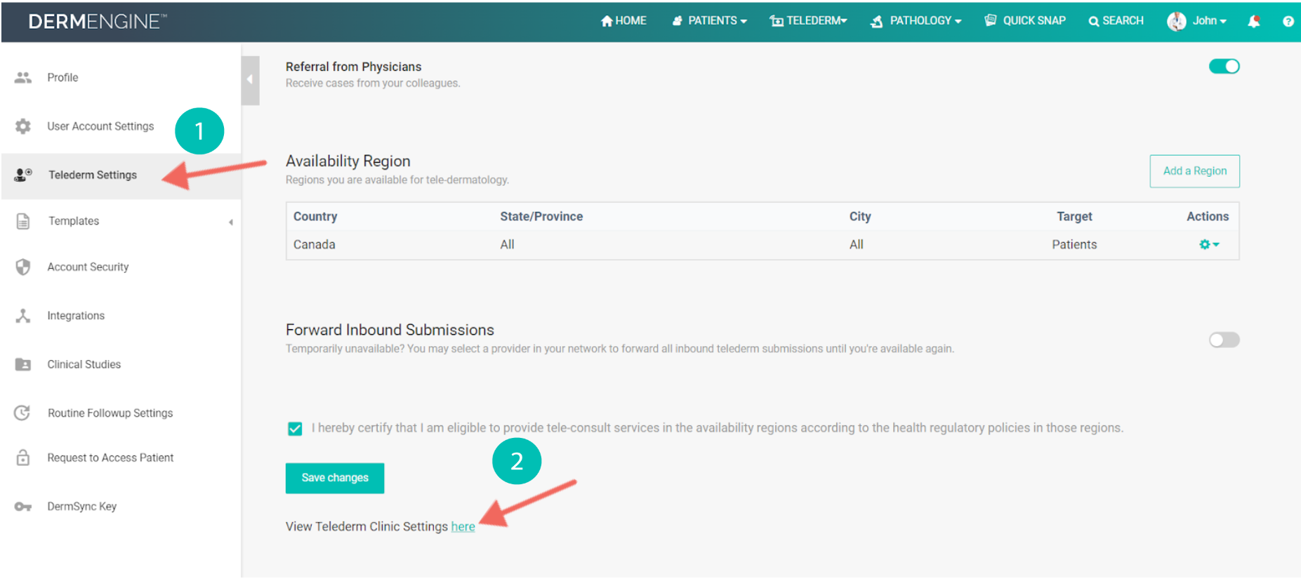 - Click on the Teledermatology settings button on the left sidebar, scroll down until the end of the page, and select 'View Telederm Settings here".