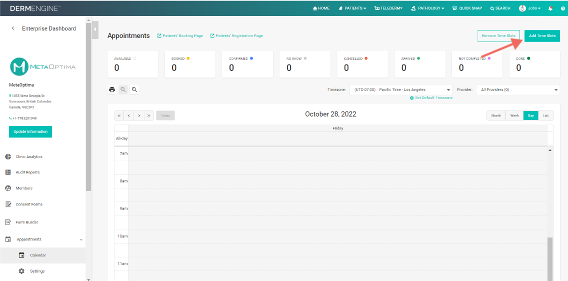 - This is your Appointment Booking page, where you can add and remove your available time slots, and access your clinic’s patient registration and booking pages. To add your availability, click the Add Time Slots button.