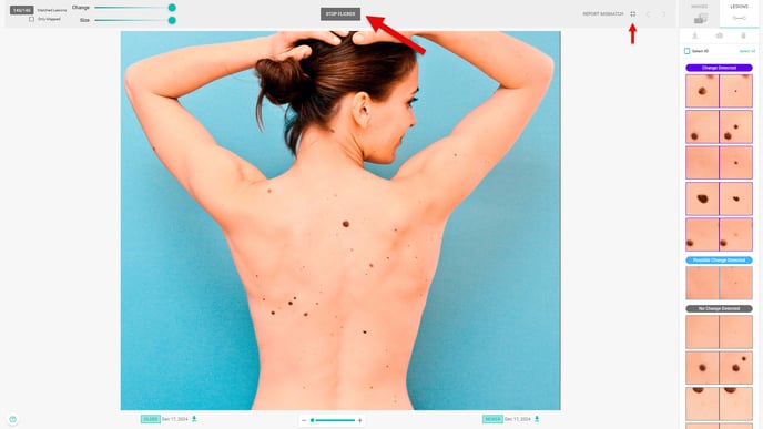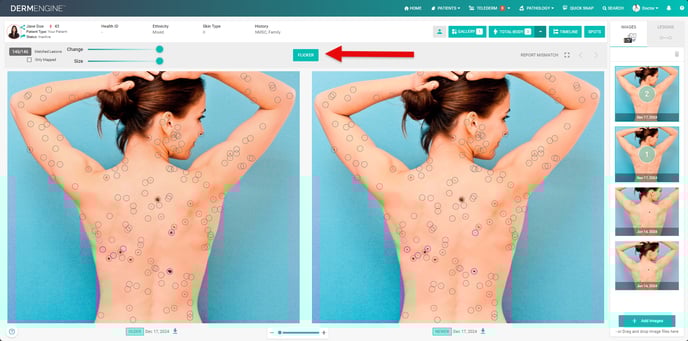 - DermEngine will overlay the two images and “flicker” between them to help you identify any changes that may have occurred.